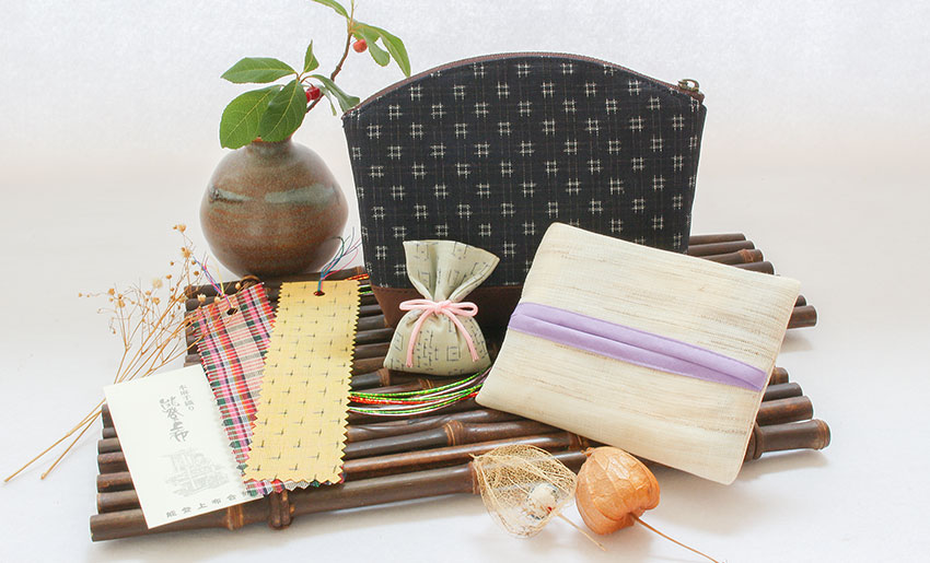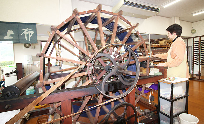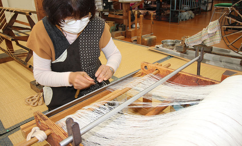 能登上布会館は反物 中能登の伝統産業である「能登上布」の保存と継承のため、平成8年に開館しました。「能登上布」の伝統技は、能登上布振興協議会によって今も受け継がれており、ここでは、作業工程の見学や機織り体験も行うことができます。また、ここで織られた反物から数多くの商品が作られ、そして販売され、町の産業の振興に貢献しています。「能登上布」は麻独特の通気性の良さや軽さに加え、サラリとした肌触りがあり、細やかな絣(かすり)模様が特徴です。絣が細かくなるほど仕上がった製品は高価になります。